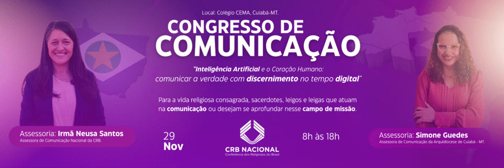 A Conferência dos Religiosos do Brasil, do Regional Mato Grosso, vai realizar, no dia 29 de novembro de 2025, o Congresso de Comunicação, com o tema “Inteligência Artificial e o Coração Humano: comunicar a verdade com discernimento no tempo digital”. O encontro será realizado no Colégio CEMA, em Cuiabá-MT, das 8h às 18h, reunindo agentes da Pastoral […]